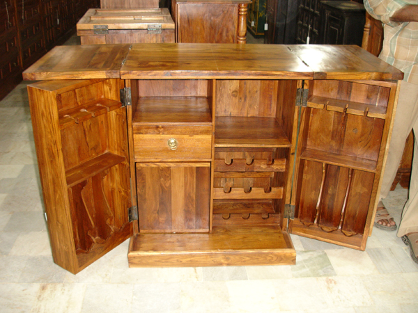 Open view of a brass bar-cabinet made out of red-brown sheesham hardwood.