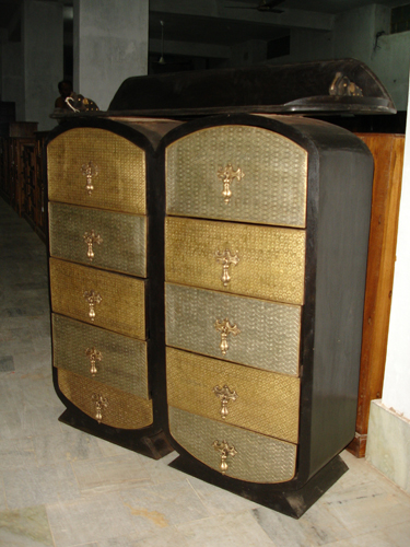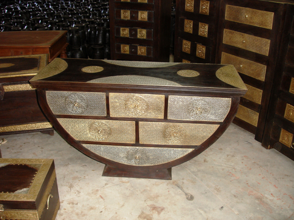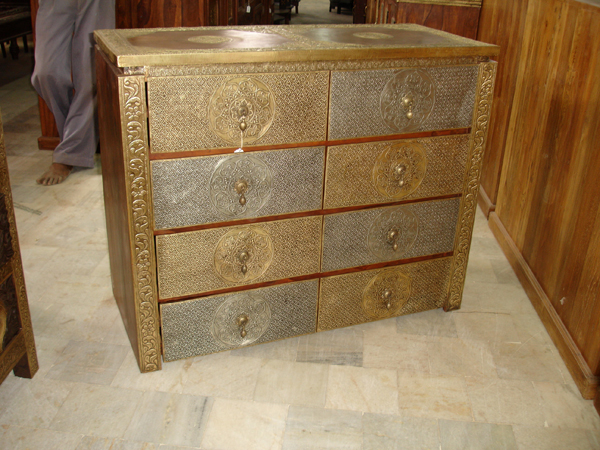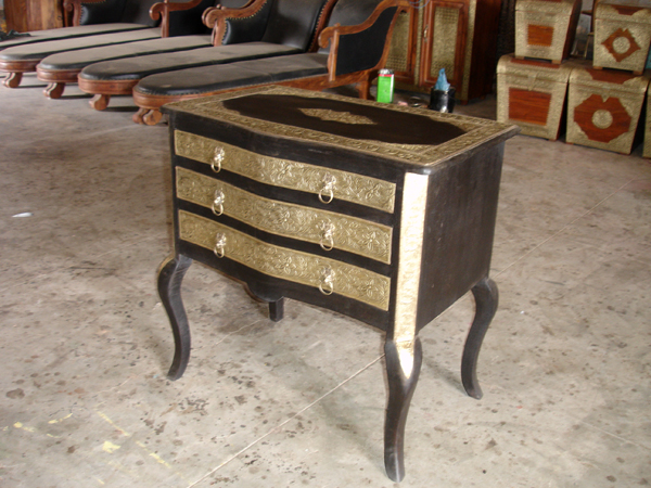 Completely fabricated with carefully crafted designed brass coating on a teakwood drawer - table.