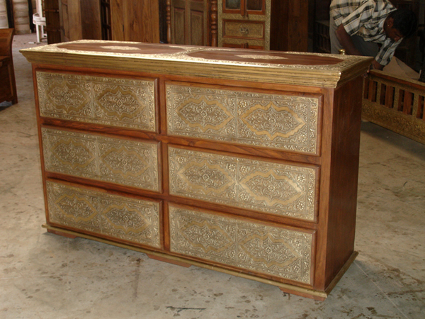 Folkloric brass design plates bonded on a rosewood table, with drawers.