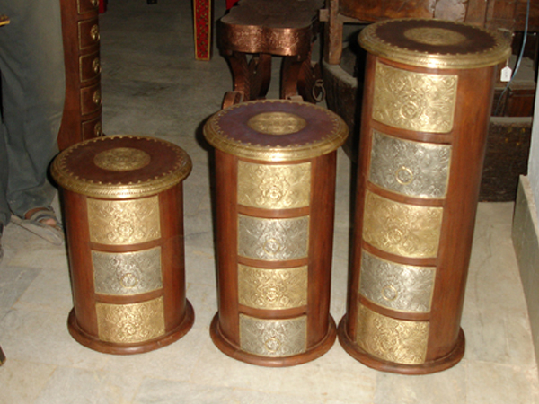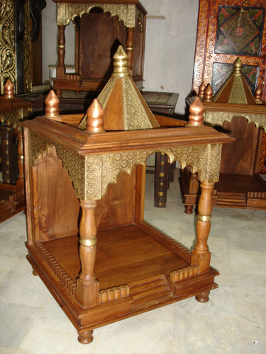 Temple house, with many drawers, bonded with brass designs. It is made out of sheesham.