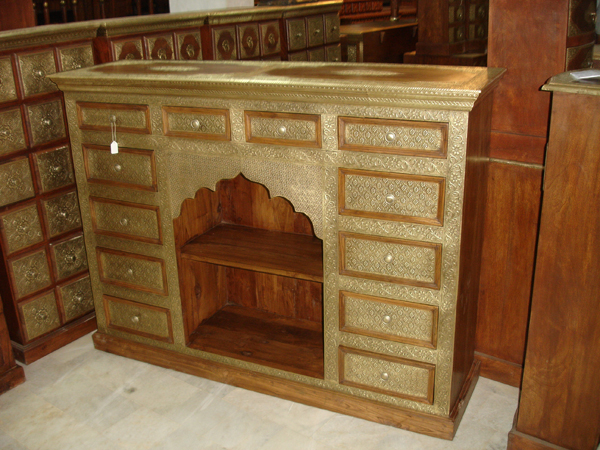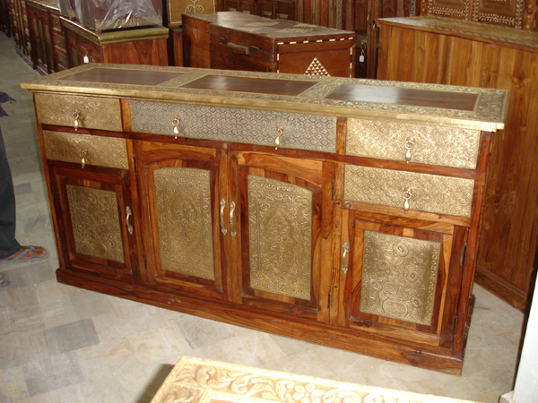 Sideboard with compartment units, cut out of sheesham hardwood with brass embroidery.