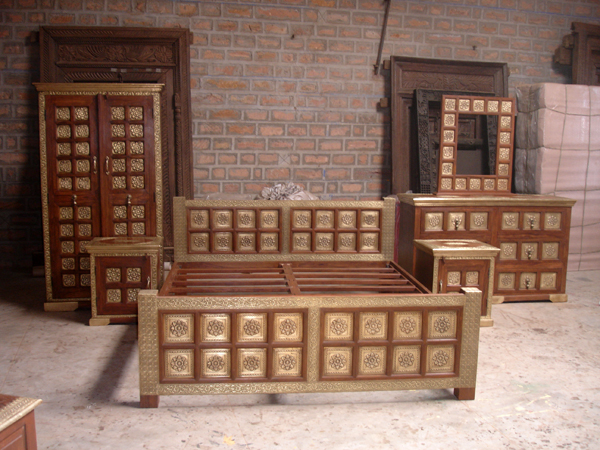 A whole bedroom set, made of sheesham red hardwood, with block brass design plates.