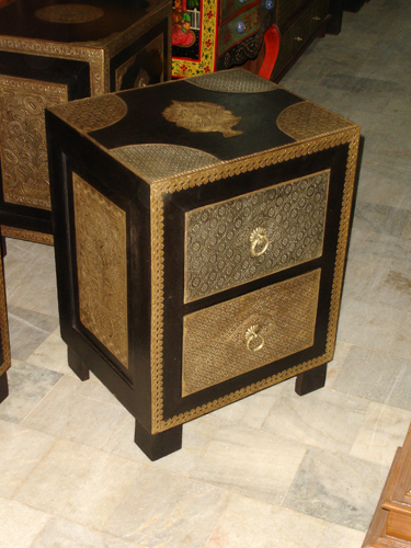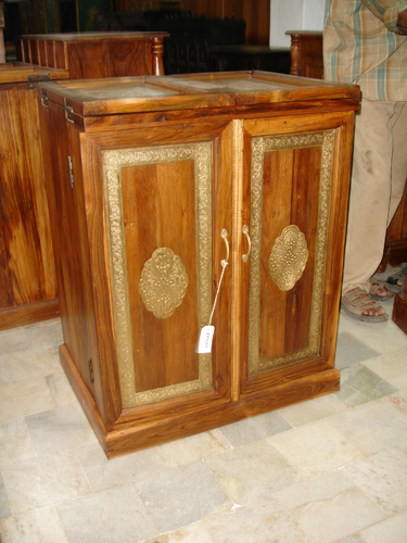 Teakwood small cabinet furniture table, with brass design.