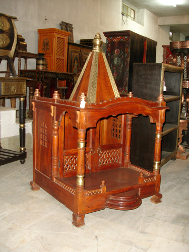 A home temple, made out of red-brown hardwood, with brass work.