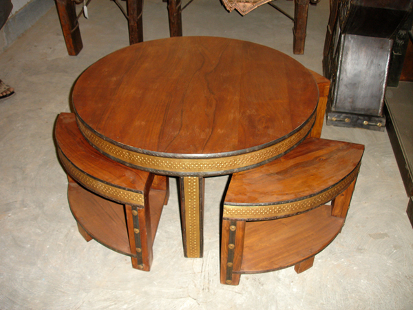 A three-chair piece radial nesting-cum dining table set made out of red wood, with brass borders.