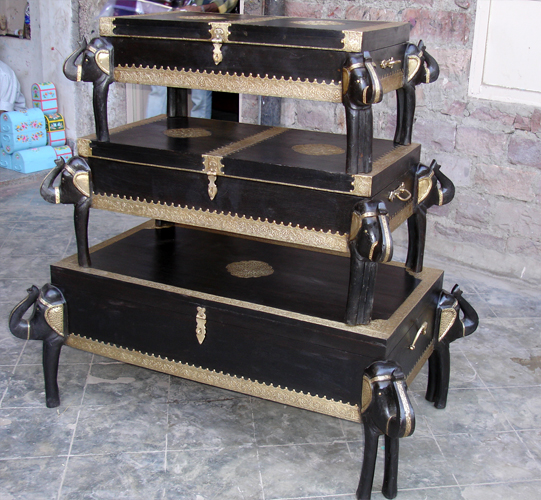 Set of three, treasure chest made out of dark rose wood, with ethnic brass borders.